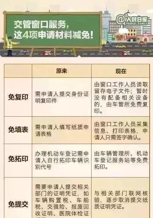 再见车管所!9月1日起车辆年检大改革发表时间:2018-08-25 11:07 买车容易养车难 办理汽车业务更是让很多车主朋友头疼 异地车辆检测两地跑 手续证明两头补 业务办理排长队 …… 下面有一则好消息等你接收! 从2018年9月1日起 这些难题将成为历史 为积极回应人民群众对美好生活的新期待、新要求,贯彻落实国务院全国深化“放管服”改革转变政府职能电视电话会议精神,按照国务委员、公安部部长赵克志关于深入推进“放管服”改革批示要求,日前,公安部部署进一步深化改革,提升交通管理服务便利化工作,并公布了简捷快办、网上通办、就近可办等20项交通管理“放管服”改革新措施,9月1日起全面启动推行。 6月28日,公安部推出了《20项交通管理“放管服”改革新举措》,自2018年9月1日起,将全面推行全国“通检”——机动车跨省异地检验、驾驶证省内异地申领、办理流程网络化、材料减免等20项便民措施。 划重点 一、9月1日起施行全国“通检”,异地开车的车主,可直接在行驶城市办理年检、申领检验合格标志;部分地市(下文附)还可以申请代驾代检服务,专人替你开车上线检。 二、6年内免检的车辆,车主可直接在网上申领免检标志,无需再前往柜台办理。 不用费时奔波,在家安安稳稳就搞定年检! 开通多网点服务,线下就近直接办! 就以往而言,车主如果身在外地,办理年检业务很麻烦,必须要回原年检单位办理,跑来跑去费时费力。新政实施后车主可以享受全国通检政策了!不只是小型汽车,就连货车、中型客车都可以享受该政策。 新政策实施后,办理异地年检就和在当地年检一样,不需要乱七八糟的步骤和资料,直接就可以检测。 驾驶证省内异地申领,简单便利。 此前,公安部已全面放开驾驶证异地申领,但省内异地申领驾驶证,仍需提交所在地居住证或者暂住登记凭证。 此次改革,公安部在完善升级信息系统基础上,逐步放宽异地申领驾驶证条件,进一步便利群众就近、自主考试领证。 新措施规定,放宽小型汽车驾驶证异地申领条件,2018年9月1日起,本省(区)申请人可凭居民身份证直接申请;跨省(区)异地申请人在办理所在省(区)任一地市居住证后,也可直接在全省范围内申领。 也就是说: 一是本省居民持身份证省内“通考”。 对在省(区)内不同地市申领小型汽车驾驶证的,申请人可凭居民身份证直接申请,无需再提交居住证或暂住登记凭证。 二是外省居民持居住证省内“通考”。 对跨省(区)异地工作、生活的人员,在办理所在省(区)任一地市居住证后,也可直接在全省范围内申领小型汽车驾驶证。以上措施将自2018年9月1日起实行。 申请材料减免,一证即办,耗时立降。 目前,办理驾驶证业务非常麻烦,不仅需要各种各样的证明,还要经过繁琐的手续,有时候排队等一天都办理不了,好不容易请个假,时间都浪费了,烦!烦!烦! 新政实施后: 1.办理业务,四项材料减免! 2. 办理18类驾驶证业务只需要携带本人驾驶证就可以办理! 而且车主只需要在一个窗口就可以办理所有业务,大大节省了车主的时间,提高了工作人员办事效率! “一证即办”的具体业务事项如下: 在如今异地用车逐渐增多的情况下 这些新便民措施的全国推行 对于广大车主来说 绝对可以算是一个大福利 异地用车,不再那么心塞! 快点把好消息转告给你们的好友吧! |